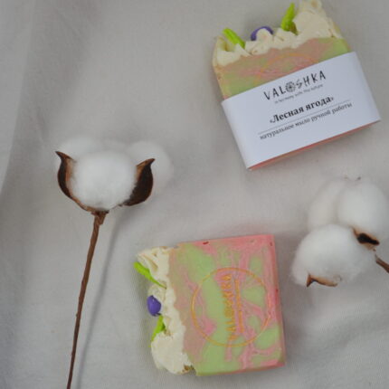 Мыло ручной работы «Лесная ягода» сварено на основе натуральных растительных масел. Яркий аромат лесной земляники никого не оставит равнодушным.. Входящие в состав соли молочной и лимонной кислот (лактат и цитрат натрия) придают дополнительные антибактериальные и кондиционирующие свойства.