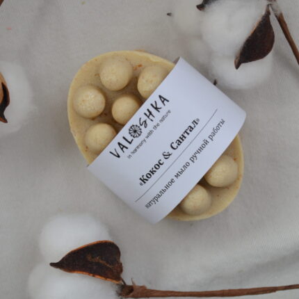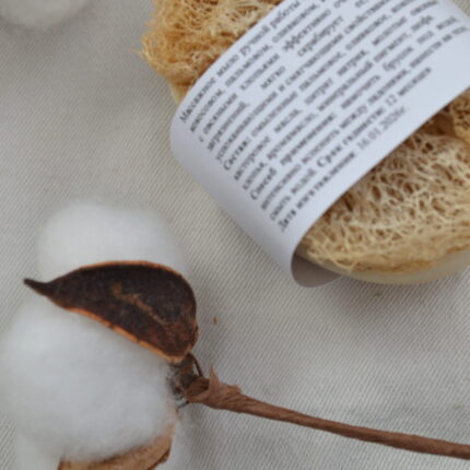 Массажное мыло с люфой ручной работы «Кокос & Сантал» на кокосовом, пальмовом, оливковом, касторовом маслах с овсяными хлопьями эффективно очищает кожу от загрязнений, мягко скрабирует ее, обладает успокаивающими и смягчающими свойствами.