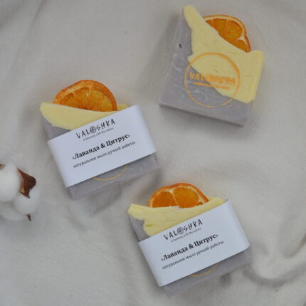 Натуральное мыло ручной работы «Лаванда & Цитрус» сварено на основе натуральных растительных масел с добавлением эфирных масел лаванды, лимона, лайма и грейпфрута.
