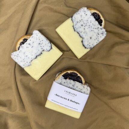 Натуральное мыло ручной работы «Апельсин & Имбирь». Мыло-скраб обладает прекрасными очищающими и ухаживающими свойствами. За счет натурального мака прекрасно отшелушит все ороговевшие частички кожи, способствуя обновлению клеток. Согревающе-пряные эфирные масла апельсина, имбиря и др. создают непередаваемый аромат востока с цитрусовой ноткой настроения.