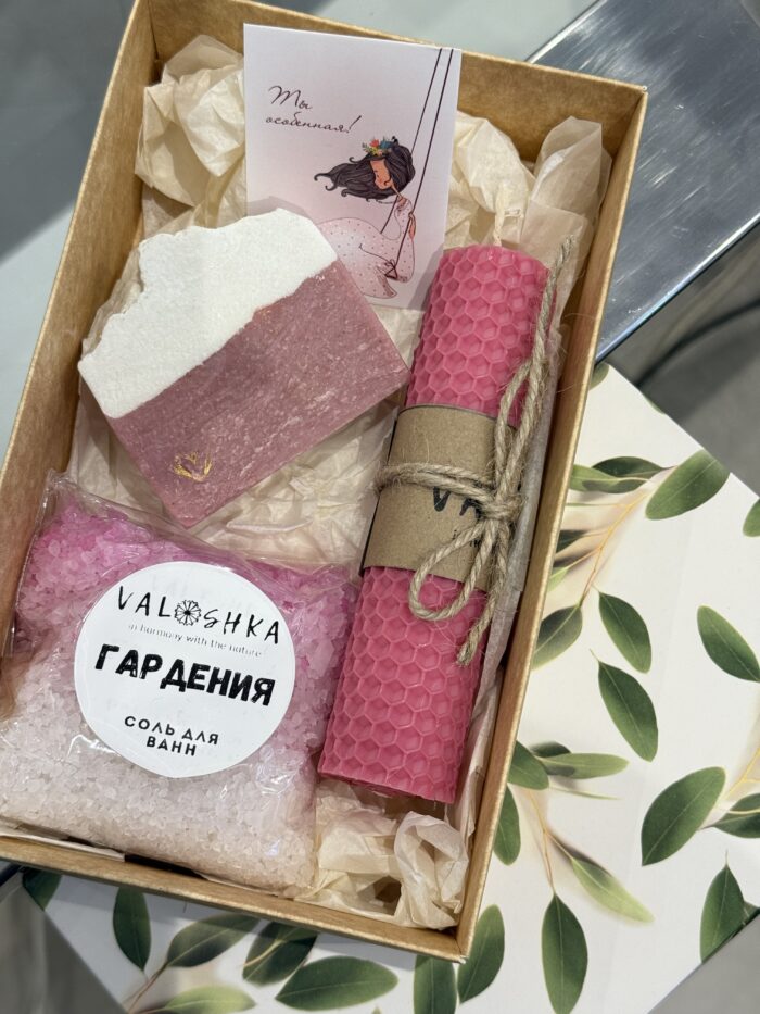 В состав эконабора входит брусок натурального мыла, соль для ванн с эфирными маслами (200 г.), а также натуральная свеча из вощины (пчелиный воск).