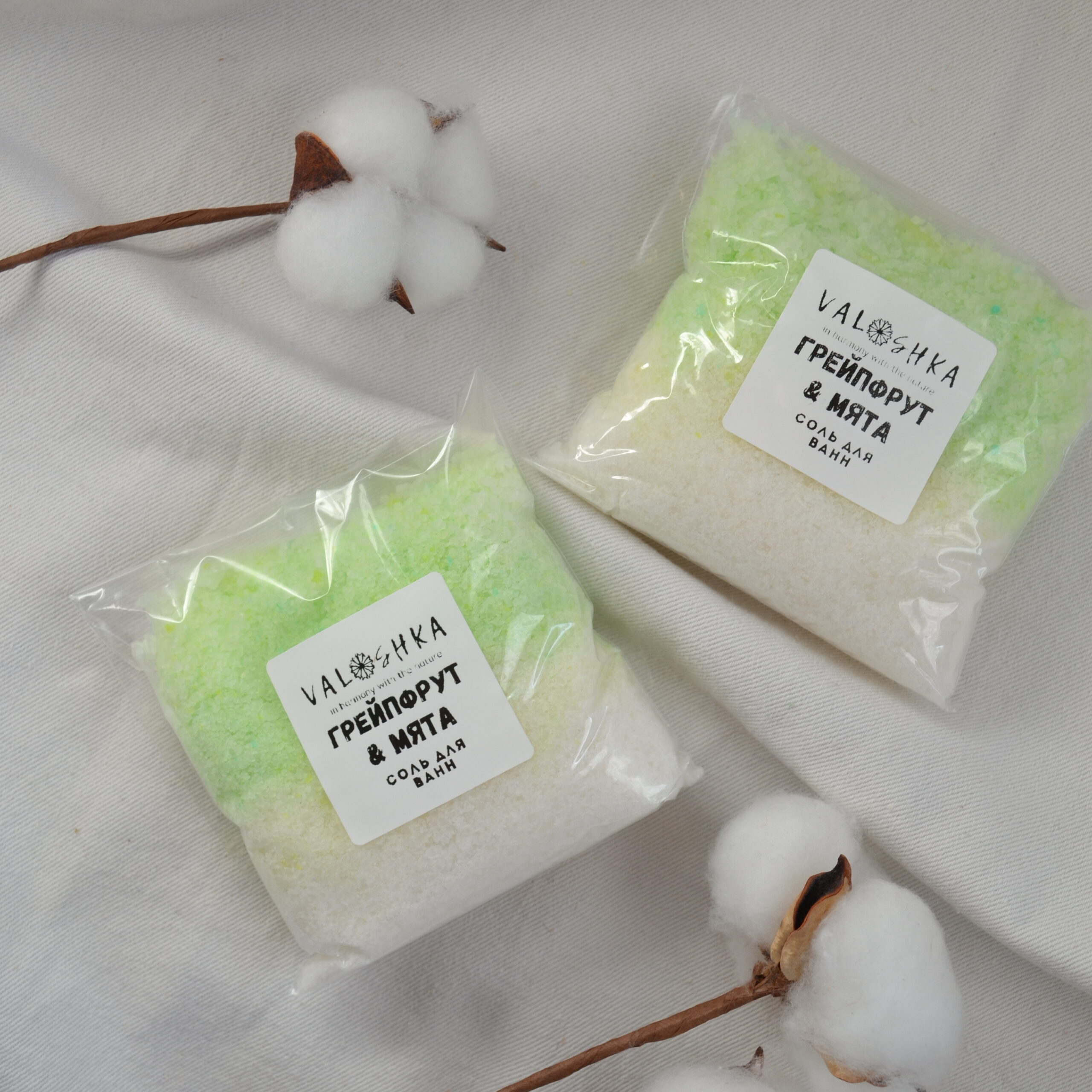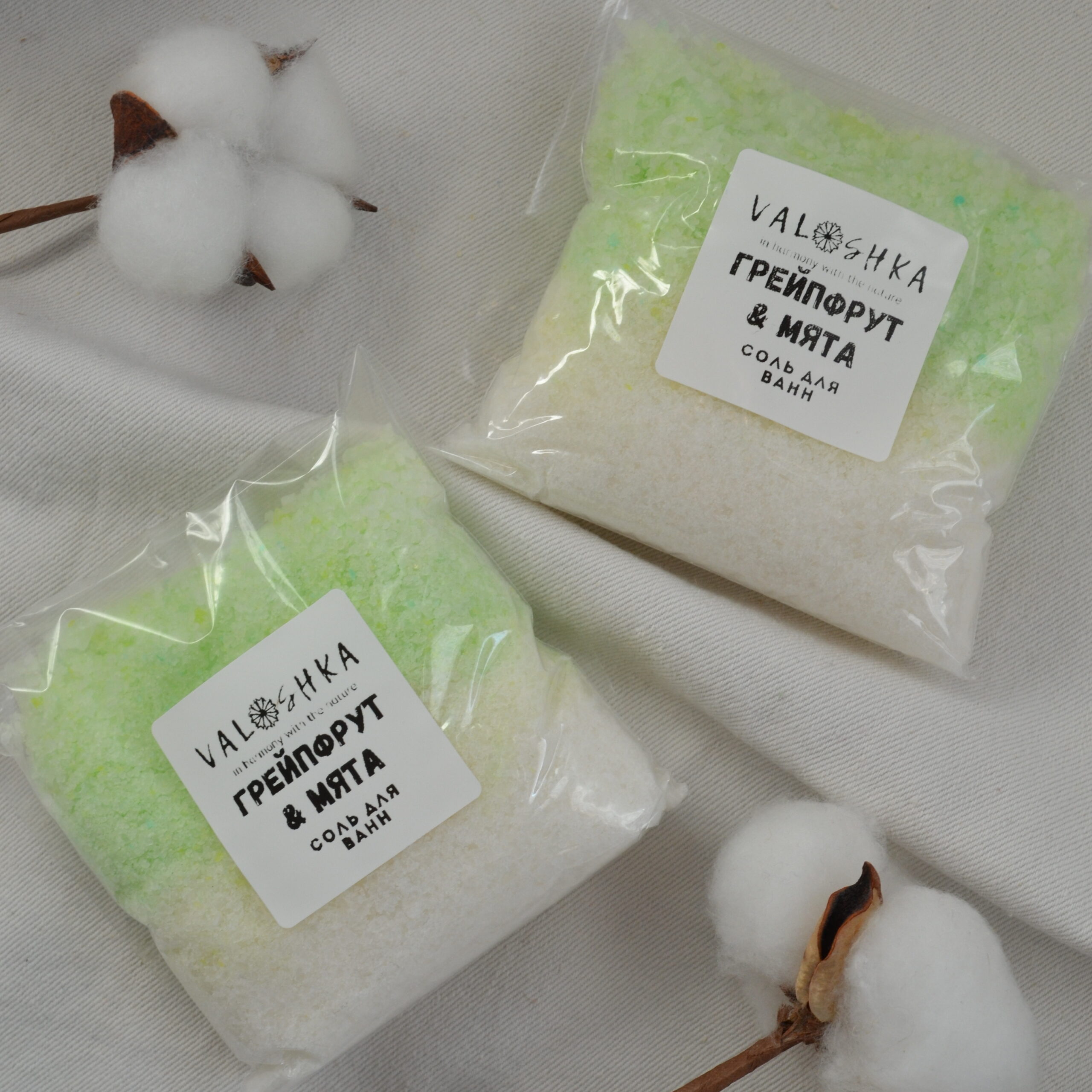 Состав: морская соль, водный хлорид магния, кукурузный крахмал, эфирные масла грейпфрута, бергамота, лимона, мяты перечной, пигмент.