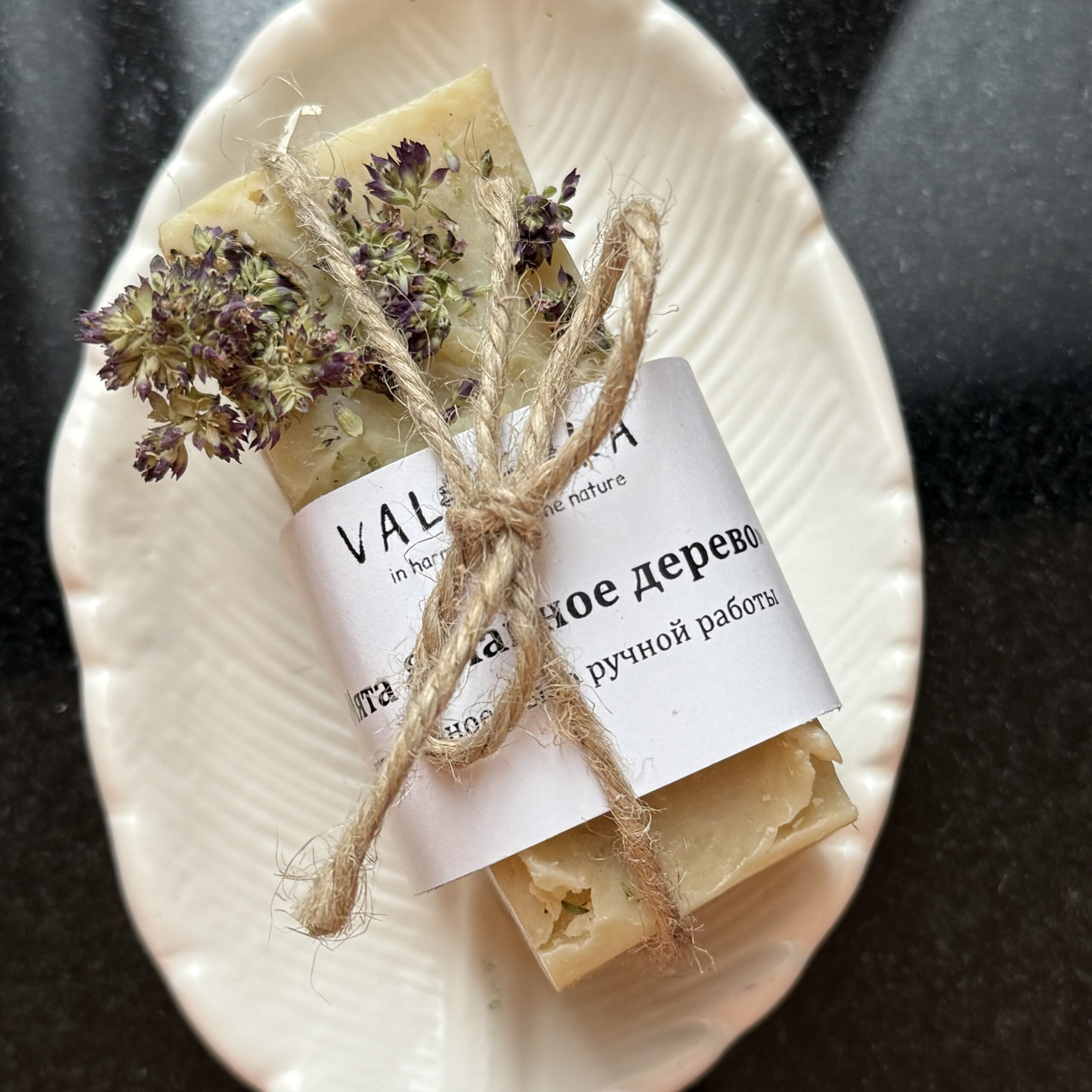 Мыло ручной работы «Мята & Чайное дерево» сварено на основе натуральных свежевыжатых соков подорожника, крапивы и репейника. Мыло не только эффективно очищает от загрязнения, но и ухаживает за Вашей кожей, идеально подходит для комбинированного и жирного типа кожи. Входящие в состав эфирные масла мяты, мелиссы и чайного дерева оказывают тонизирующее и антисептическое, противовоспалительное действие на кожу. Соки крапивы, подорожника и репейника оказывают ранозаживляющее, противовоспалительное действие.
